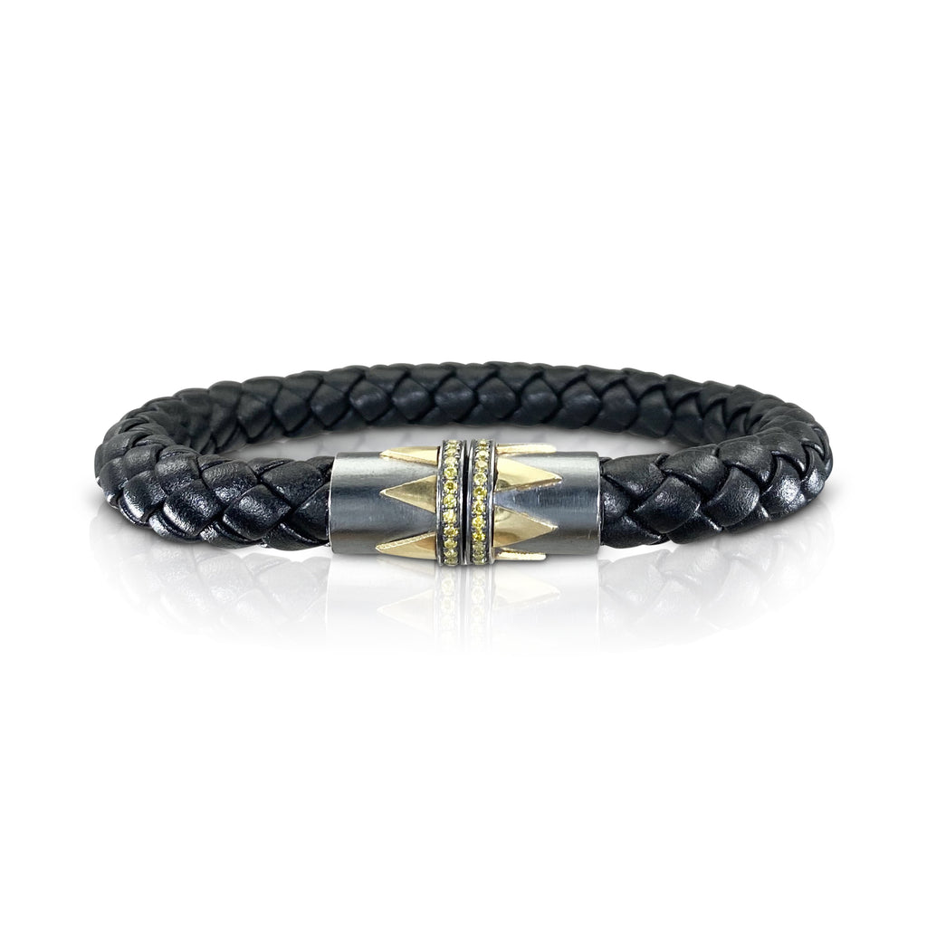 Magnet Leather Bracelet with Oxidized Silver, Gold Spikes and Yellow Diamond Clasp