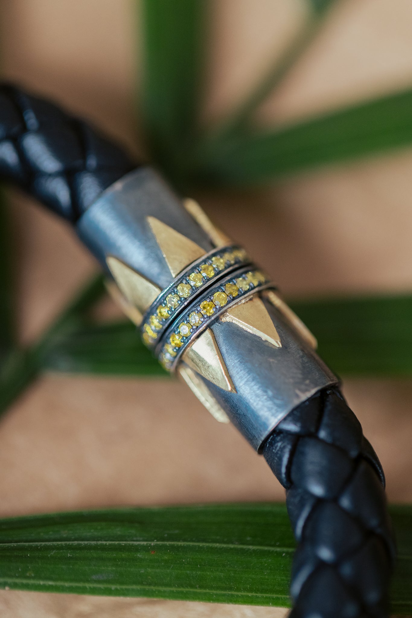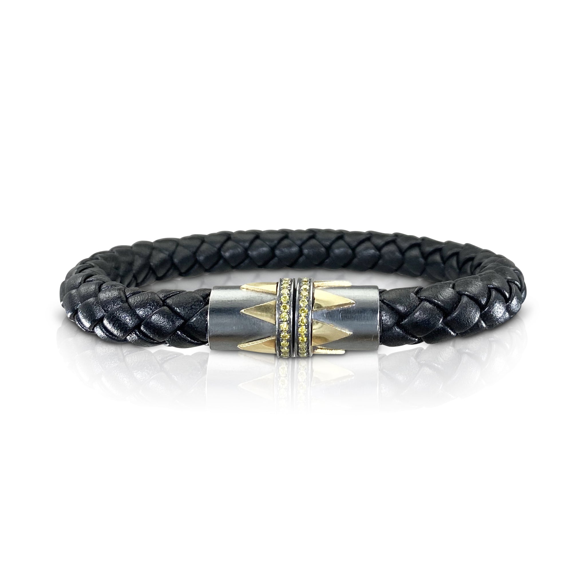 Oxidized Sterling Silver Tube Clasp 18k Gold Spikes Pavé Yellow Diamonds (.41ct tw) Braided Italian Leather Rare Earth Magnets *** If not available in your size, please fill out our custom order form and include SKU# 800-11 as...Read more