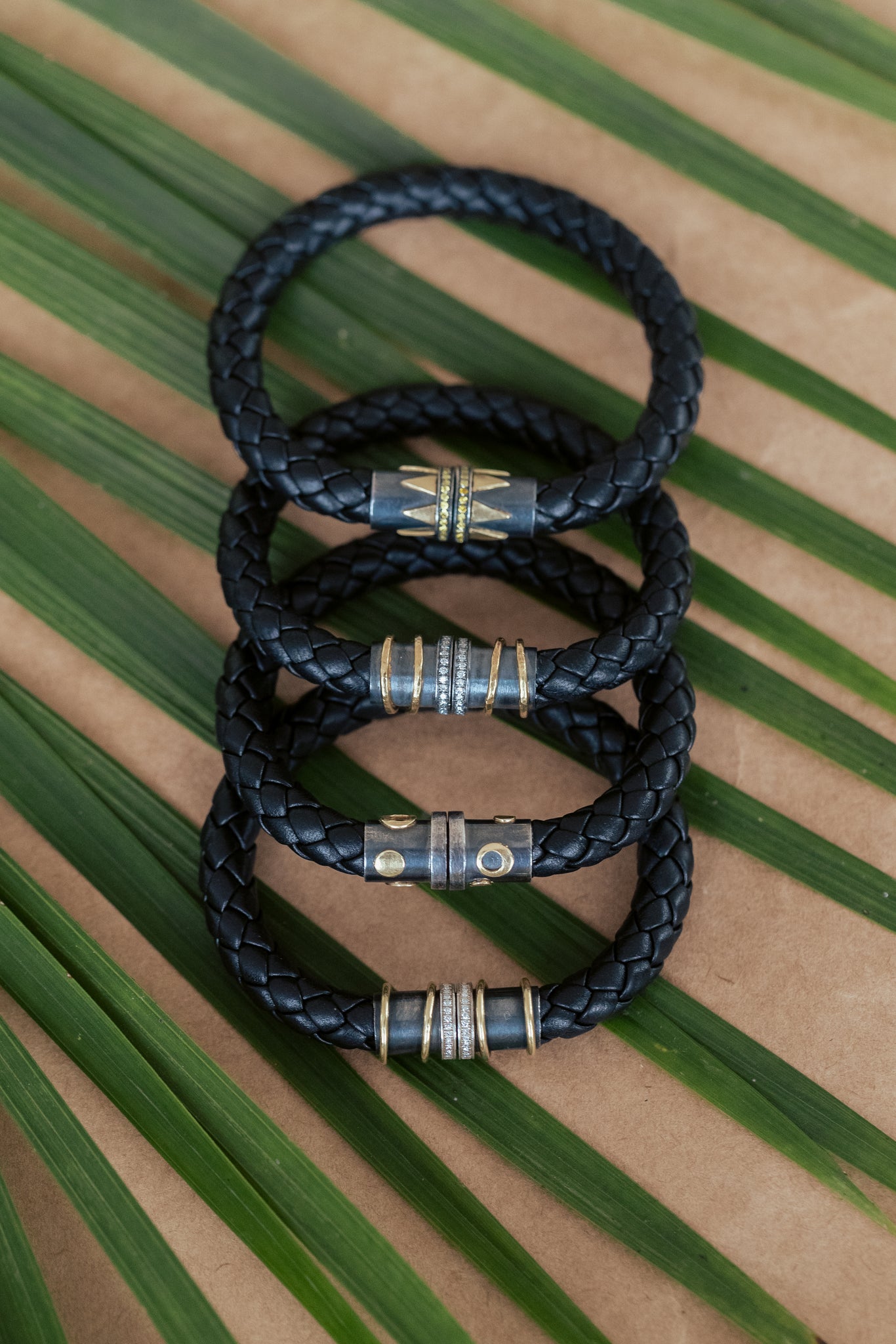Oxidized Sterling Silver Tube Clasp 18k Gold Ribs Pavé Diamonds (.30ct tw) Braided Italian Leather Rare Earth Magnets *** If not available in your size, please fill out our custom order form and include SKU# 800-9 as a reference...Read more