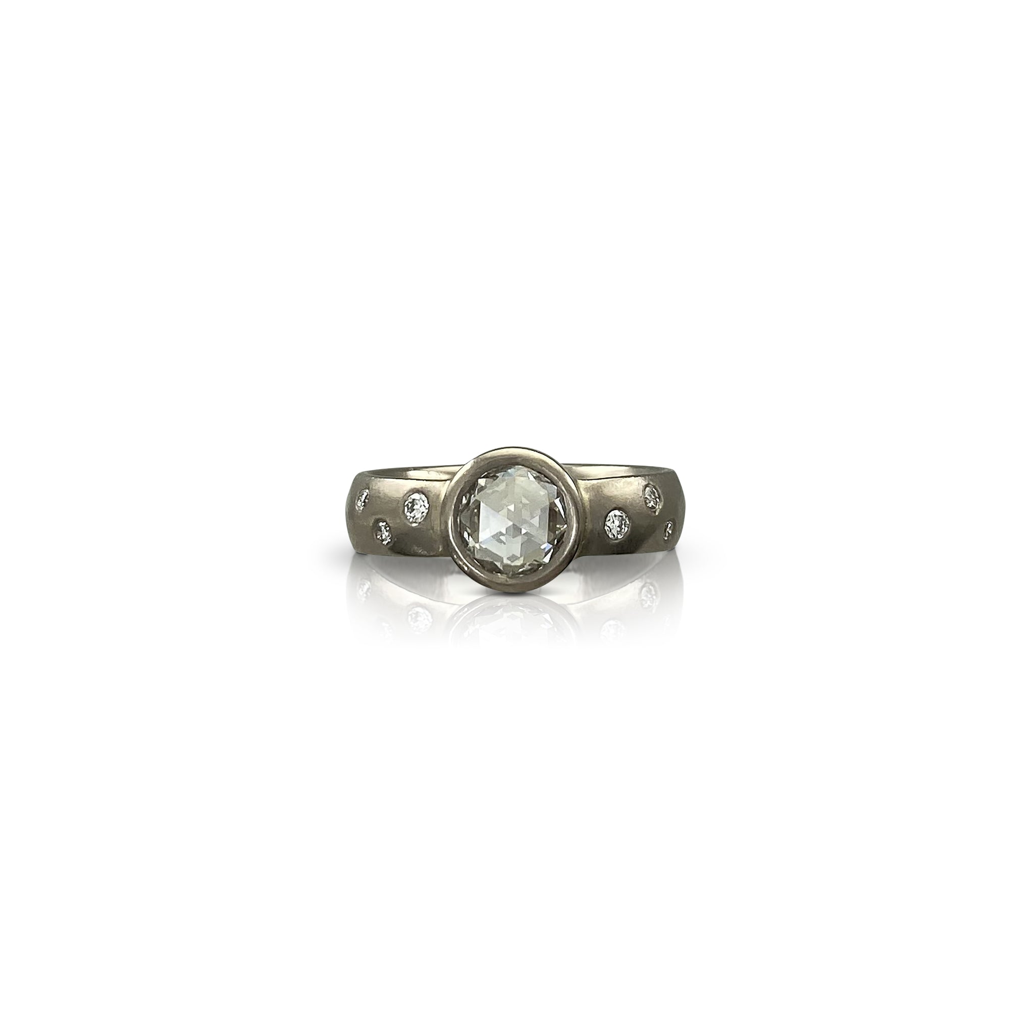 Palladium White Gold Rose Cut Center Diamond (.66ct) Diamonds (.09ct tw) Product Note: Ring has different sizes of round diamonds sprinkled all the way around band. *** If not available in your size, please fill out our custom order...Read more