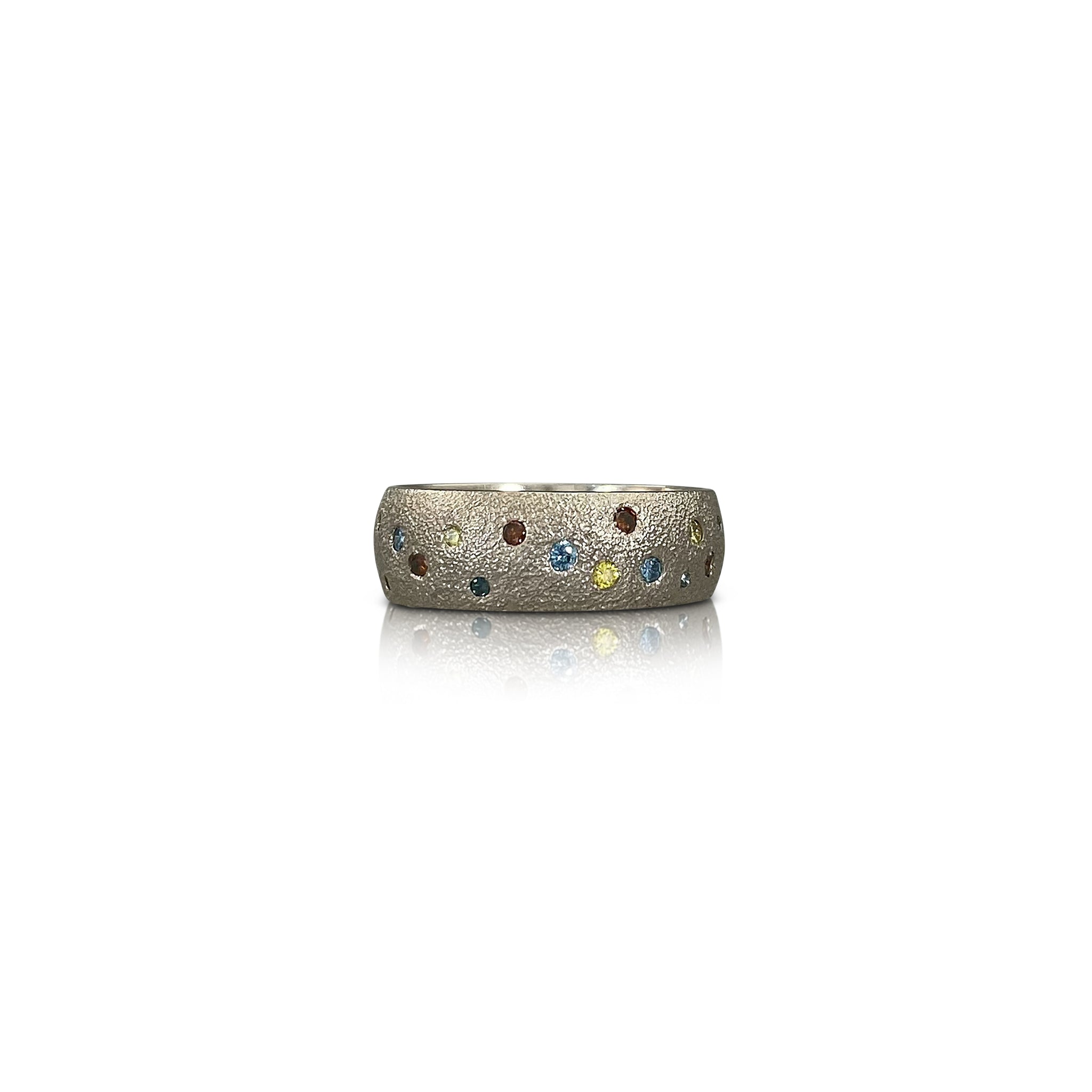 Sprinkle Band in Hammered Palladium White Gold with Multi Colored Diamonds